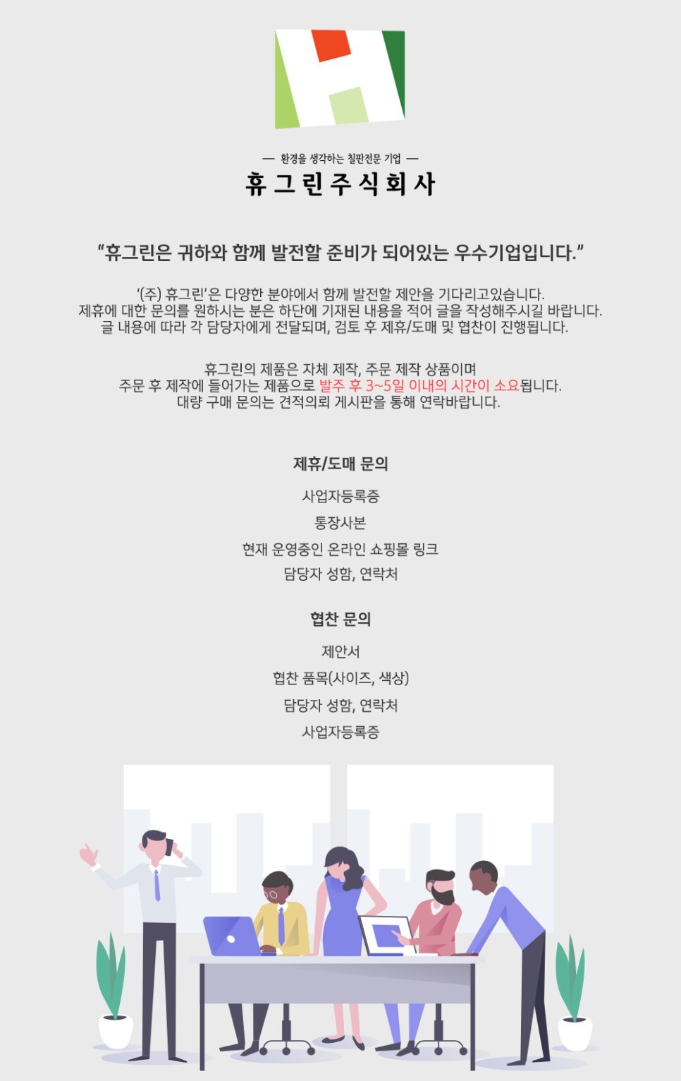 휴그린주식회사는 만들어진 제품이 아닌 주문 즉시 제작하는 제작상품으로